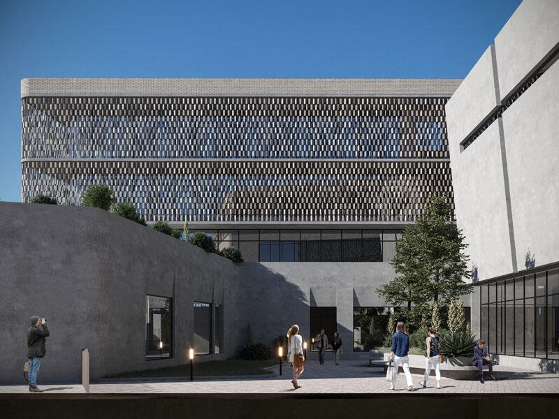 The building is divided into four main volumes, whose separation is emphasized through their form and the treatment of façade materials. Access to the property is from the western side of the site, both for pe-destrians and vehicles. In total, the building has 5 entrances to meet the needs of its functions
